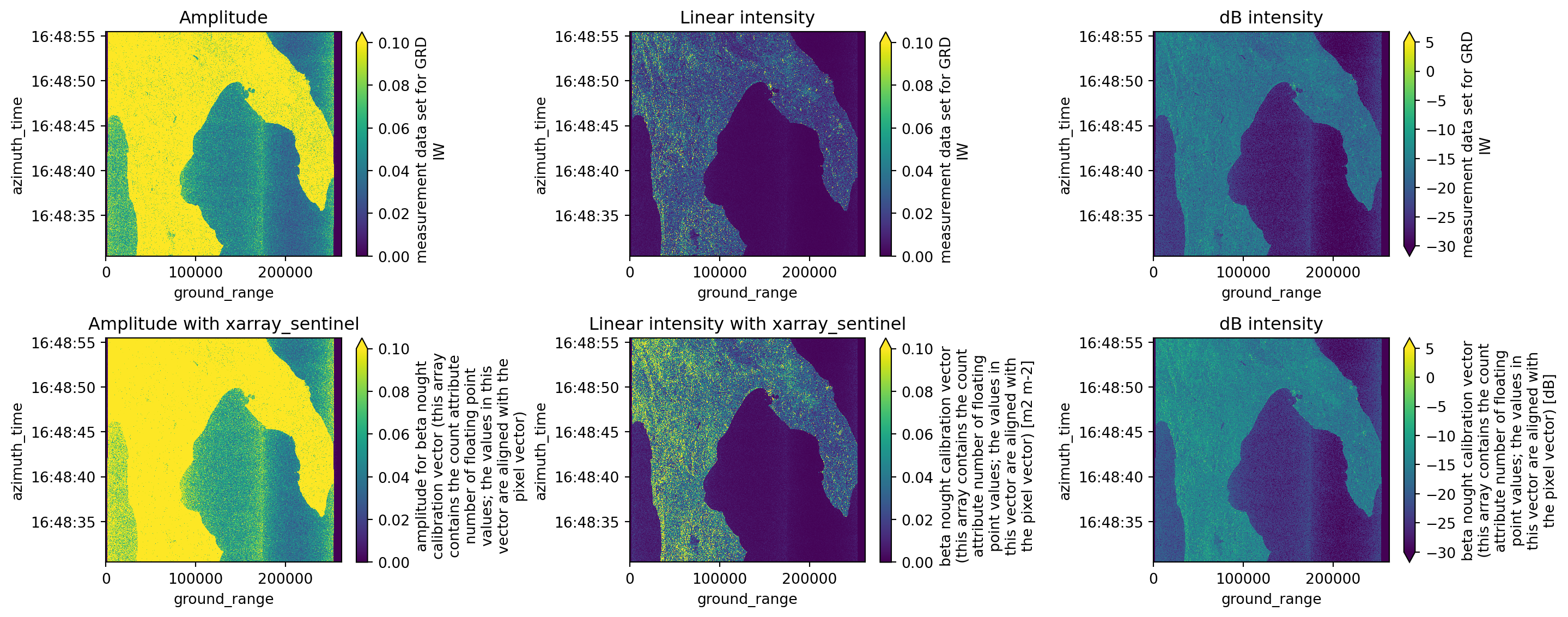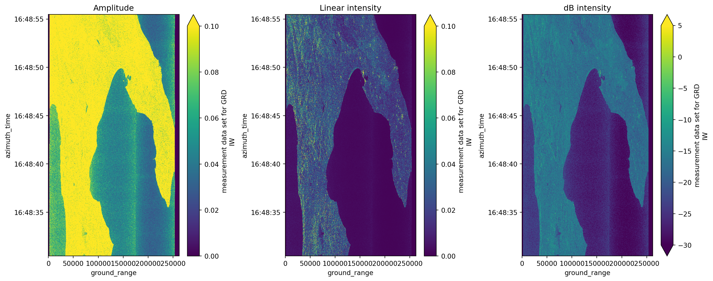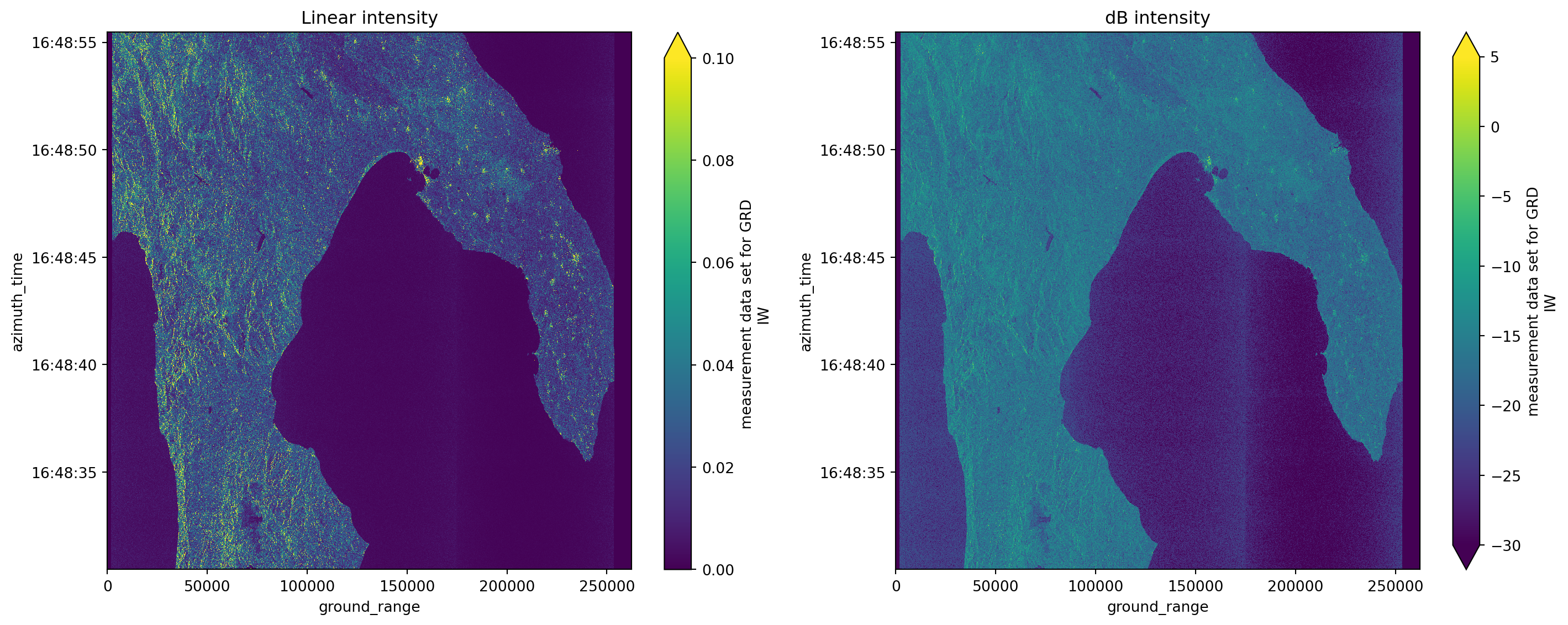 grd, calibration.beta_nought, as_db=True)# plotting amplitude with both linear intensity and dB intensity results vs with xarray_sentinel calibration functions