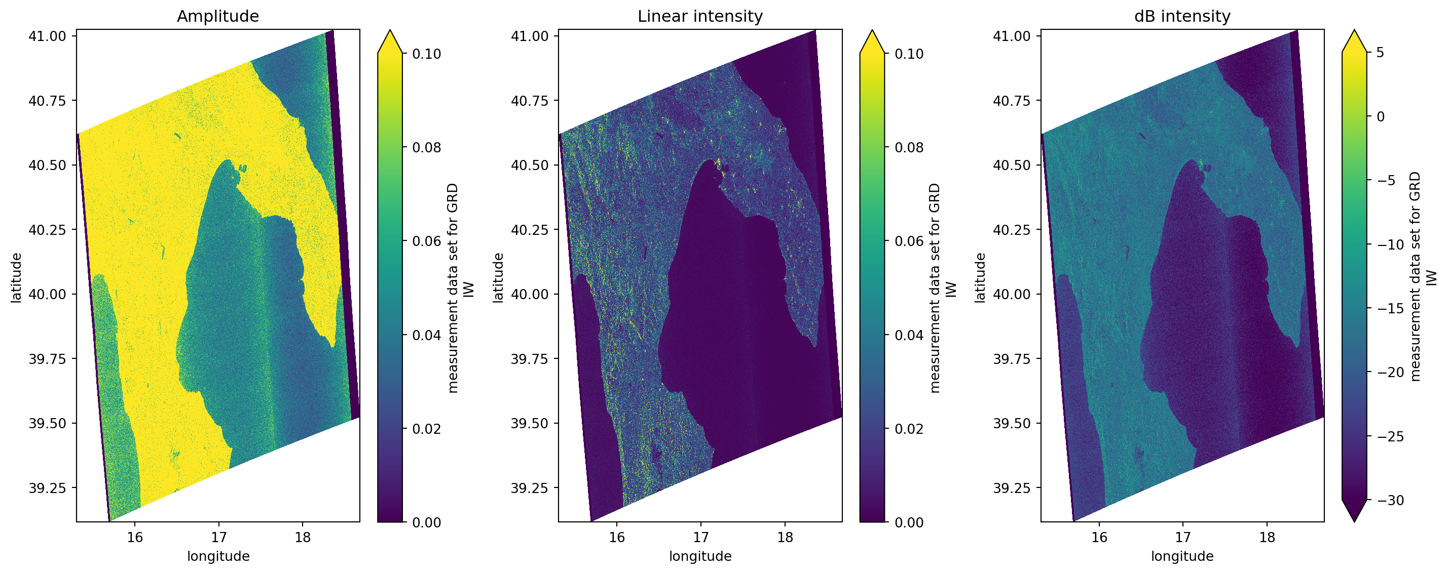 During this tutorial we’ve learnt how to compute amplitude and intensity calibration on Sentinel-1 GRD data and how to georeference measurements.grd variable into geographical coordinates.