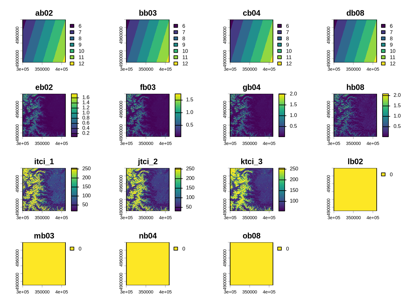 names(tr) # has non-unique names, e.g. three times "b02" [1] "b02" "b03" "b04" "b08" "b02" "b03" "b04" "b08" "tci_1"