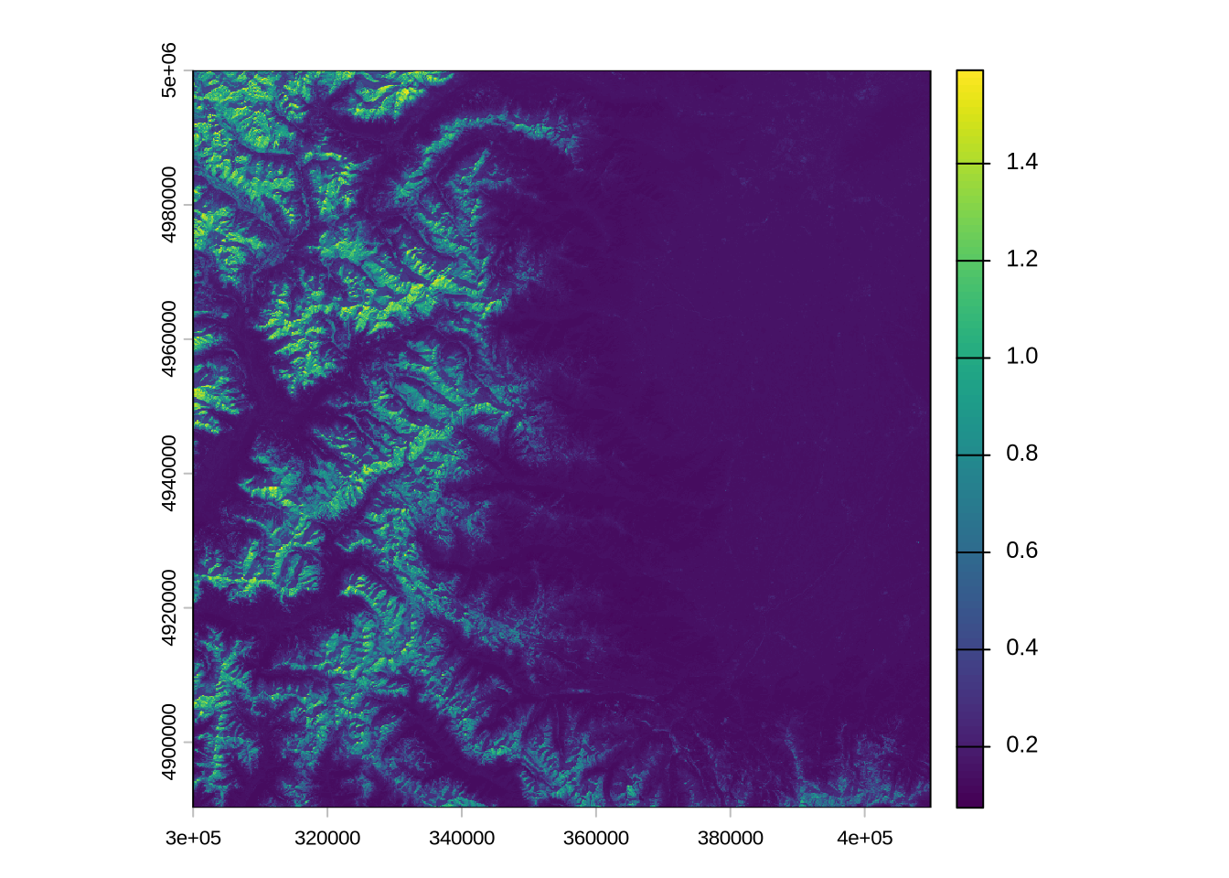 st_crs(r) = crs Our data is in CRS WGS 84 / UTM zone 32N (EPSG:32632). We can now safely plot it as a static map…