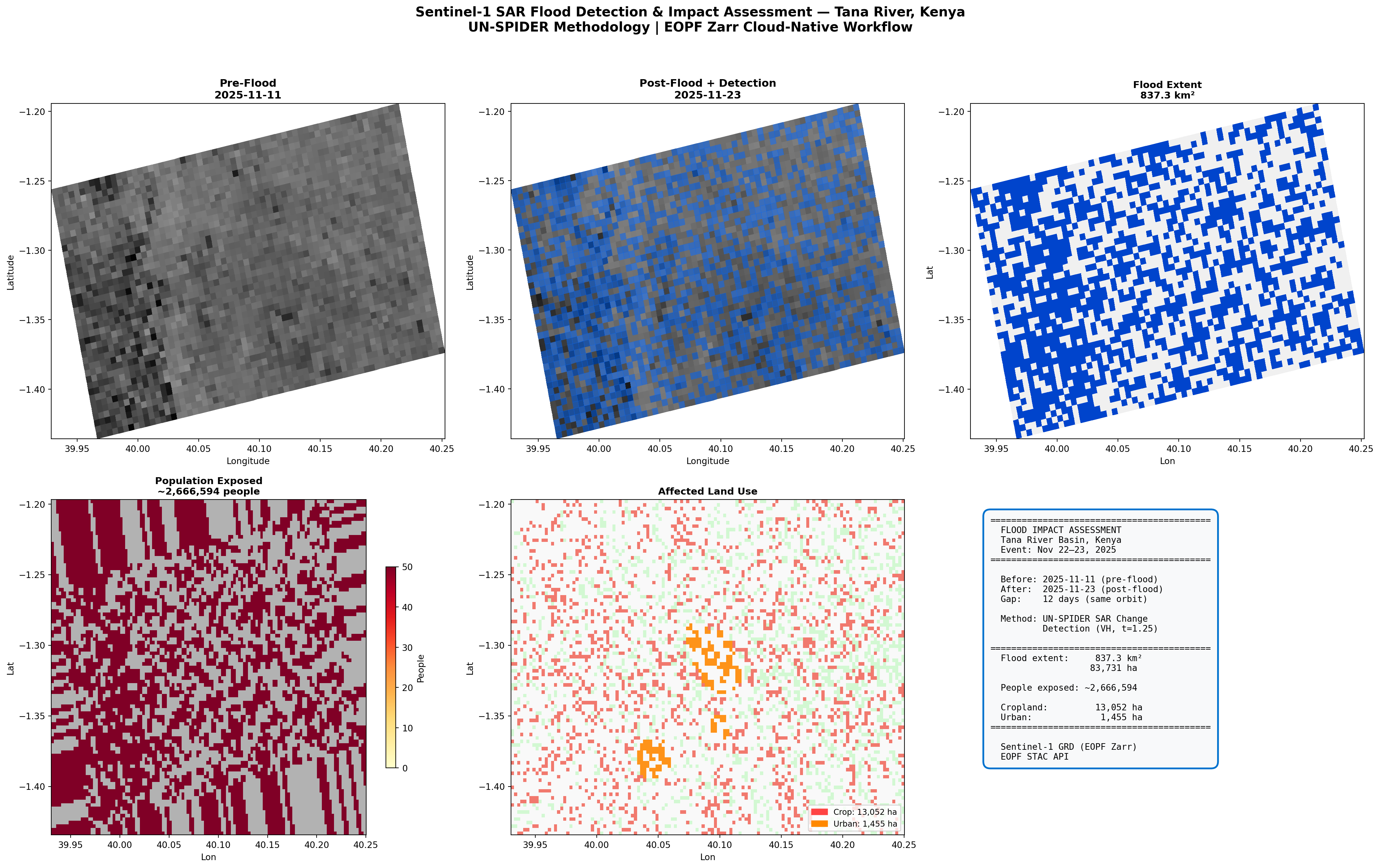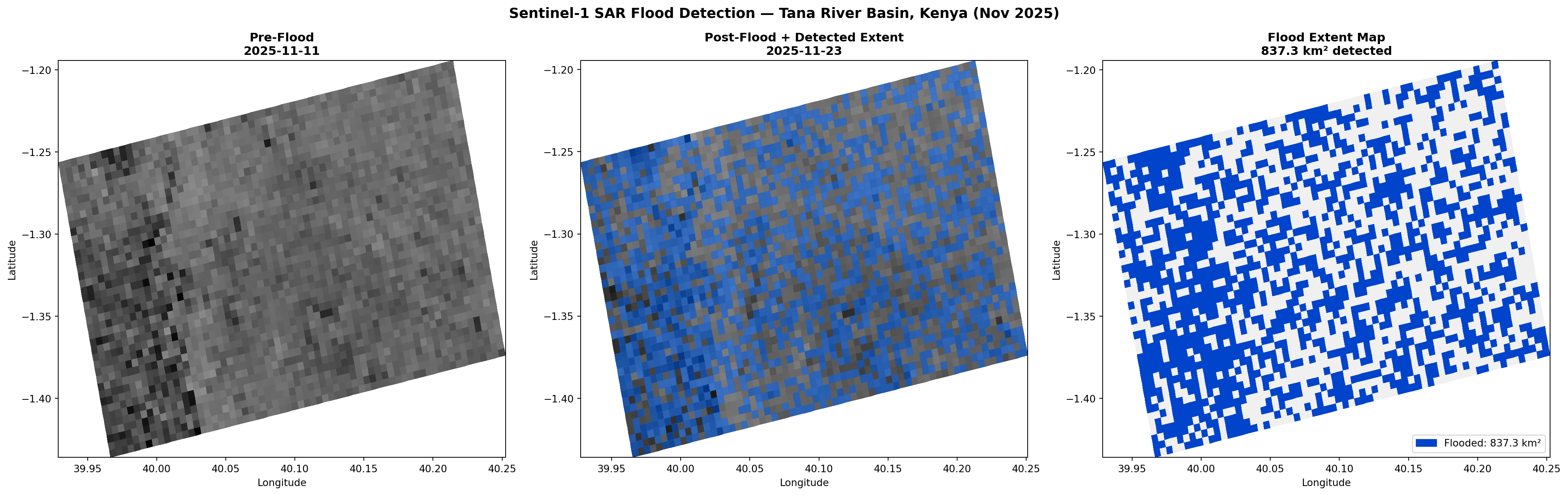 fig.suptitle('Sentinel-1 SAR Flood Detection & Impact Assessment β Tana River, Kenya\n'