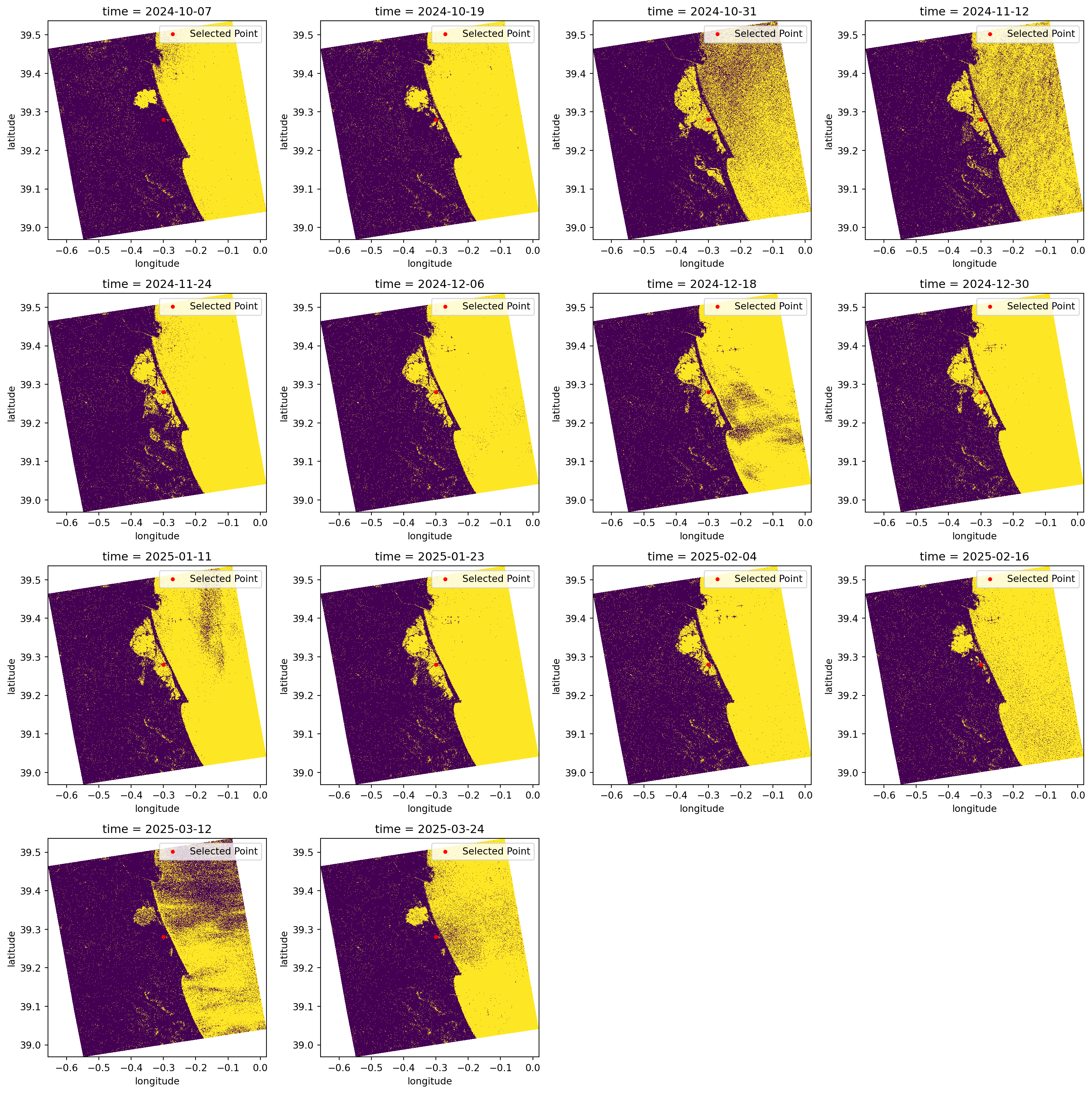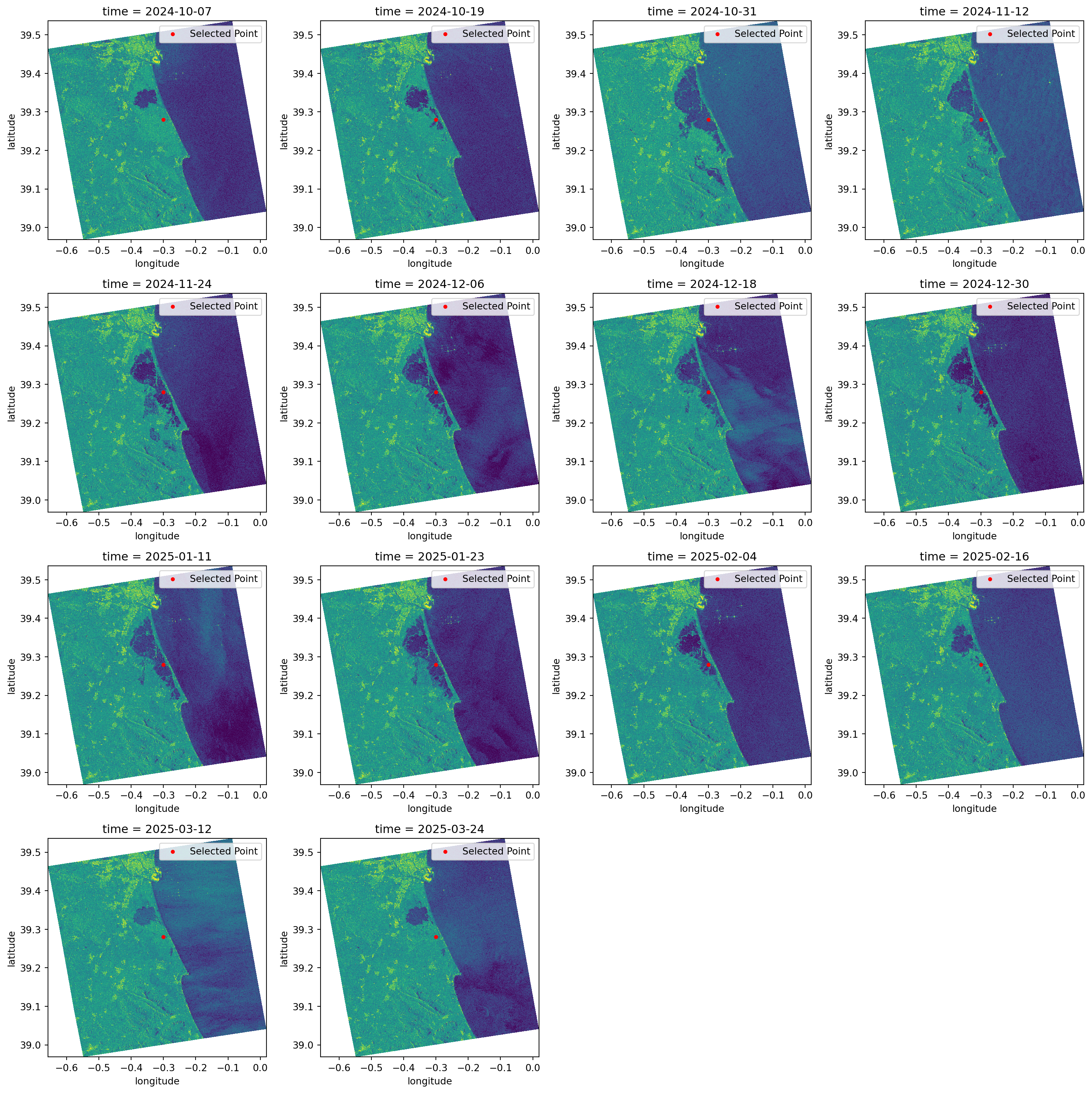 WATER_THRESHOLD_DB = -15It is interesting to study the flood event over a specific point within the area of interest.