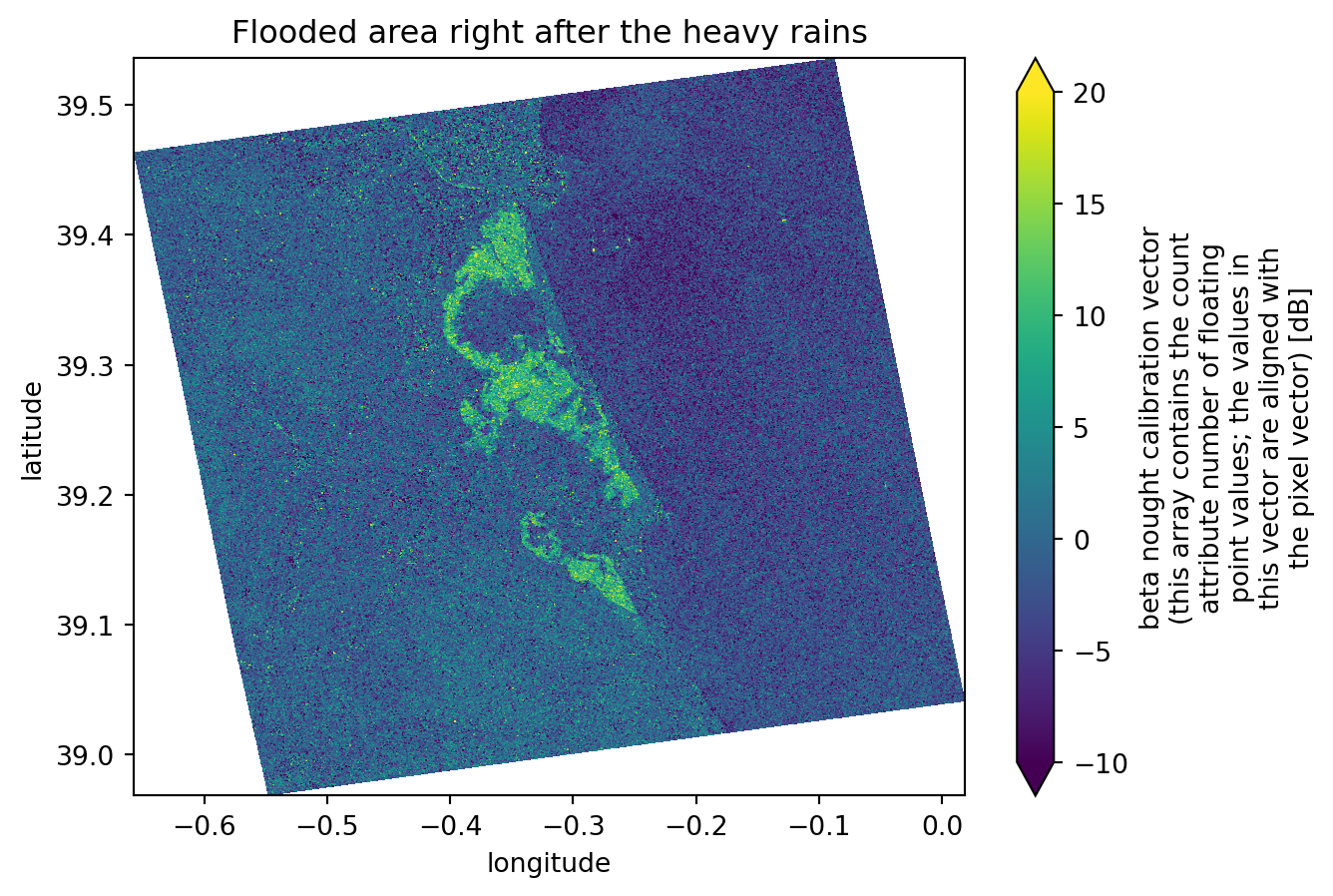 Knowing the exact flood date, which we have, and from the images plotted previously, we can easily see that the second image is the one right before the flood event and that the third image is the one directly after it. These two images show significant differences in the flooded areas and backscatter values, ranging from -5 dB (in the image before the event) to -20 dB (in the image directly after the event).