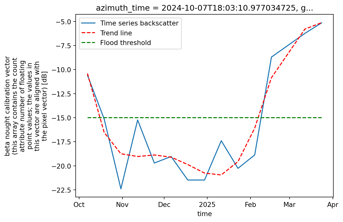 Now we can plot the data cube, showing the backscatter intensity over the target point we defined earlier. Since the datasets are stacked along the time dimension, it becomes much easier to plot the evolution of water backscatter at a specific location. This provides an effective way to monitor the flooding status at that point.